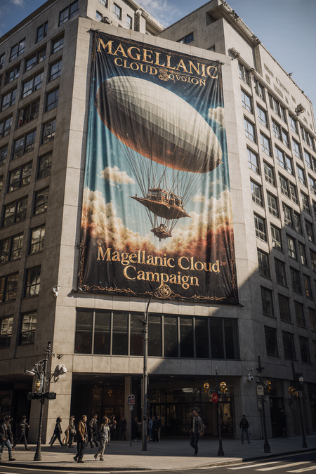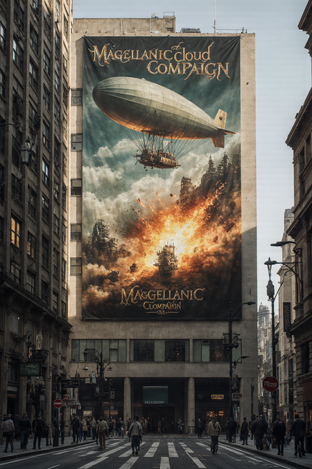 Реалистичная сцена современного города с огромным рекламным постером настольной игры «Кампания Магелланова облака» на фасаде здания. Постер изображает дирижабль в космосе, облака, логотип игры и слоган «Magellanic Cloud Campaign». Плакат выполнен в стиле аэропанк / стимпанк / космоопера, с насыщенными цветами и приключенческой атмосферой. Баннер натянут на стену многоэтажного здания, видны металлические крепления и складки ткани. Городская среда: стеклянные окна, прохожие, уличное освещение, тёплый дневной свет. Композиция: общий план здания, акцент на огромном баннере.
