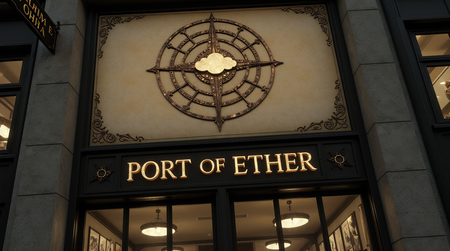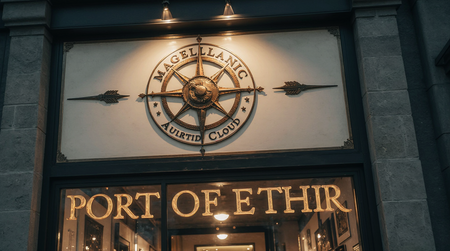 Realistic street photo of a themed board game shop called «Порт Эфира» (Port of Ether). The shop sign features a beautifully crafted metallic plaque and illuminated lettering in a refined steampunk / aeropunk style. Above the name, the logo of the board game «Кампания Магелланова Облака» is displayed — a minimalist emblem in the shape of a compass with an elegant design. The compass is made of warm copper and bronze tones with fine engraved details and symmetrical arrows pointing to the four cardinal directions. In the center of the compass — a stylized depiction of a soft cloud. The building facade blends old European and modern design: stone walls, brass fixtures, glass windows showing board games, figurines, and airship models inside.