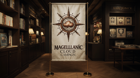 Постеры с логотипом игры Realistic photo of an interior exhibition banner inside a themed board game store called «Порт Эфира». The banner promotes the board game and features its elegant minimalist logo: a compass emblem made of warm copper and bronze tones, with fine engraved details and symmetrical arrows pointing in four directions. In the center of the compass is a stylized cloud; around it, thin concentric rings and dotted lines with small star symbols. Below the logo, in an elegant serif font, the title reads «MAGELLANIC CLOUD CAMPAIGN».