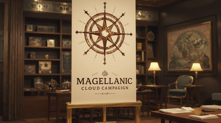 Минималистичный логотип в виде компаса с изысканным дизайном. Компас выполнен в тёплых медных и бронзовых тонах, с тонкими гравировочными деталями и симметричными стрелками, указывающими по четырём сторонам света. В центре — стилизованное изображение облака. Вокруг компаса — тонкие концентрические кольца и пунктирная окружность с маленькими звёздами. На светлом, почти белом фоне, под логотипом надпись элегантным шрифтом с засечками: «MAGELLANIC CLOUD CAMPAIGN». Логотип должен выглядеть как эмблема научно-исследовательской экспедиции или космической кампании, с ощущением престижа и спокойной уверенности.