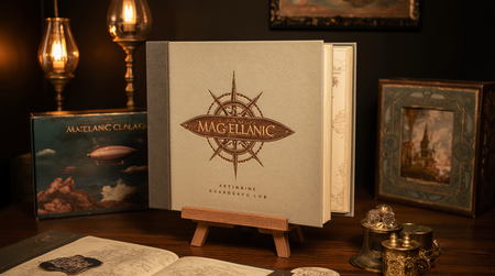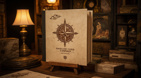 Артбук по игре Realistic photo of a high-quality artbook displayed on a wooden stand inside a themed board game store. The artbook belongs to the universe of the board game. It features a minimalist compass logo embossed in warm copper and bronze tones, with a stylized cloud at the center and fine engraved details. Below the logo, elegant serif text reads «MAGELLANIC CLOUD CAMPAIGN — ARTBOOK». The book has a hardcover bound in fabric or faux leather, in warm beige and graphite tones, with visible paper texture.
