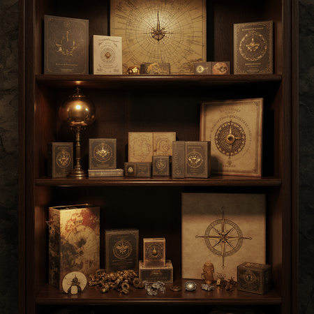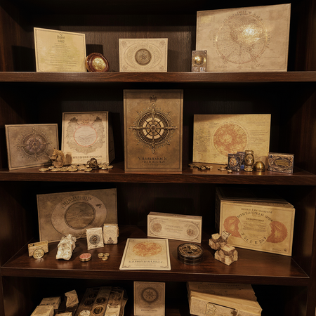Дополнительная продукция для настольной игры Realistic photo of a wooden display shelf inside a themed board game store called «Порт Эфира», filled with merchandise from the board game «Кампания Магелланова Облака». The shelf is made of dark polished wood and brass elements, illuminated by warm ambient lighting. On the shelves are various items: boxed card expansions with bronze-embossed covers, cardboard tokens shaped like crystals, hearts, and coins, resin miniatures of airships and captains, artbooks, rolled fabric maps, enamel pins, and small posters. Each item is arranged neatly, like in a collector’s showcase.