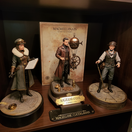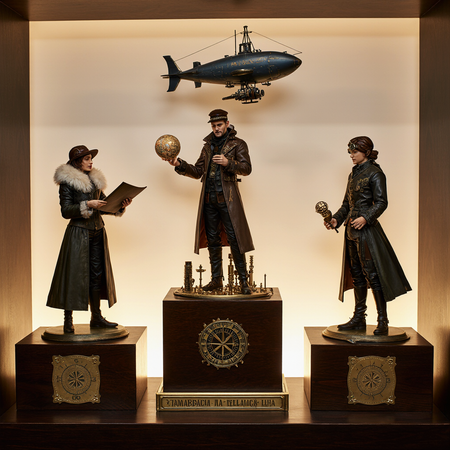 Коллекционные фигурки Realistic photo of a collector’s display shelf inside a themed board game store called «Порт Эфира», showcasing three detailed collectible figurines from the fictional board game universe «Кампания Магелланова Облака». The shelf is made of dark polished wood and brass, softly illuminated by warm ambient lighting. Displayed figurines: 1. A female captain standing on the bow of an airship, wearing a long coat with fur collar and bronze goggles, holding a map — base shaped like an airship deck with brass details. 2. A male mechanic with a mechanical arm and leather vest, holding a miniature airship model, standing on a metallic platform with pipes and steam elements. 3. A female navigator with a floating mechanical compass drone, holding a navigation device — base engraved with a glowing star chart.