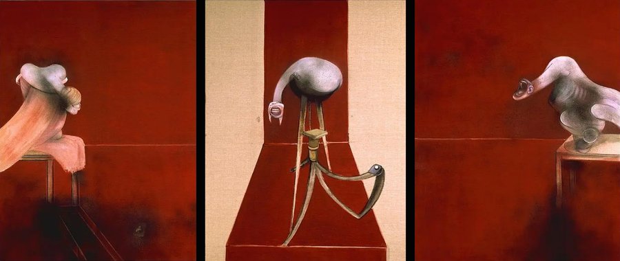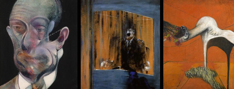 Фрэнсис Бэкон, Эскиз к портрету (Мишель Лейрис), 1978 год / Эскиз портрета, 1949 год / «Ярость», 1944 год / «Три этюда к фигурам у подножия распятия» (вторая версия), 1988 год