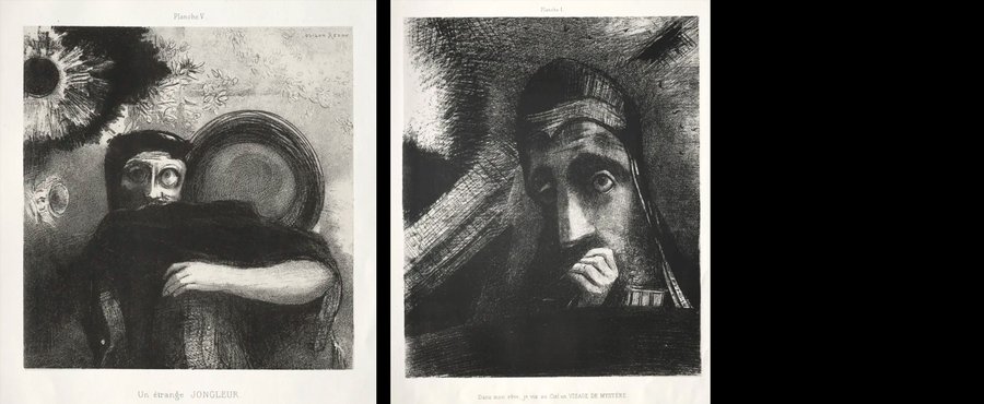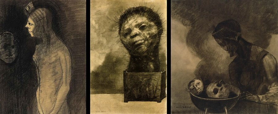 Одилон Редон, «Явление», Неизвестная дата / «Мужчина-кактус», 1881 год / «Котел колдуньи», 1979 год / «Посвящение Гойе Странный жонглер», 1885 год / «Посвящение Гойе Странный жонглер», 1885 год