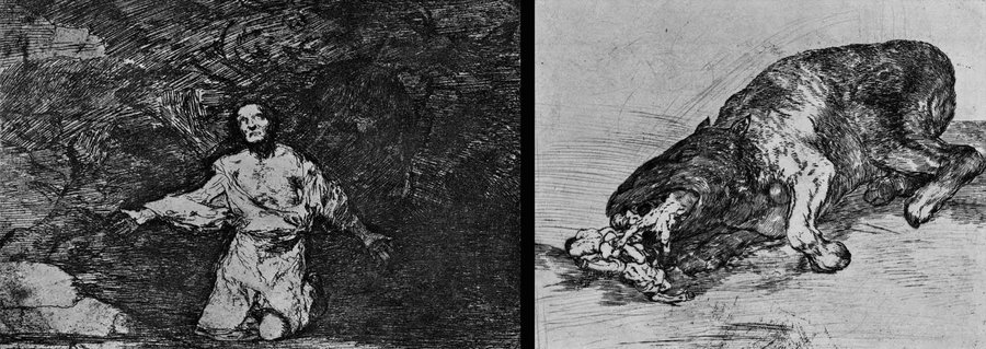 Интерпретация Гойи наполнена уже совсем другими эмоциями. На полотне нет место ничему кроме безумия и свирепости. Если в работе Рубенса чувствуется театральное начало: его фигуры разыгрывают судьбу драматически убедительным и, в конечном счёте, рациональным образом, то в картине Франсиско Гойи вечное молчание.