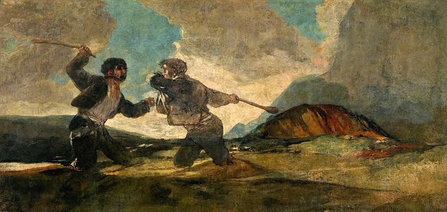 В европейской живописи до Гойи, в сценах жестокости и страдания, в основном преобладала возвышенная или театральная трактовка. Даже в самых драматичных мифологических сюжетах, как, например, в «Избиении младенцев» Гвидо Рени или в «Сатурне» Рубенса, насилие облачено в формы красоты, где тела сохраняют гармонию, а эмоции подчинены ясной композиционной логике.
