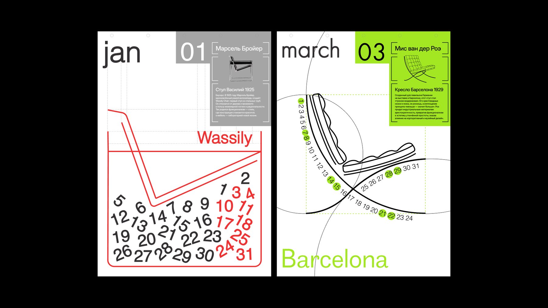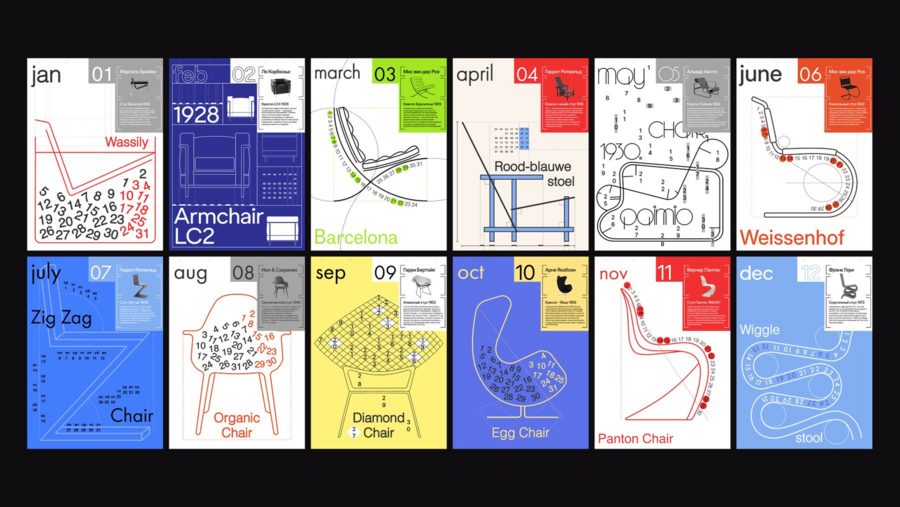 Так например календарь на 2026 год студентки 3 курса школы дизайна, Айсф Бадмаевой, посвящен всем стульям и креслам Баухауса и выполнен в лаконичном и функциональном стиле, характерном для данного направления 20-х годов прошлого века. В нем каждый месяц посвящен одному из культовых стульев, повлиявших на истории дизайна, рассказу об истории его создания. На всех листах календаря типографика, общий ритм композиции и расположения чисел месяца стилистически перекликаются с особенностями изображаемого объекта.