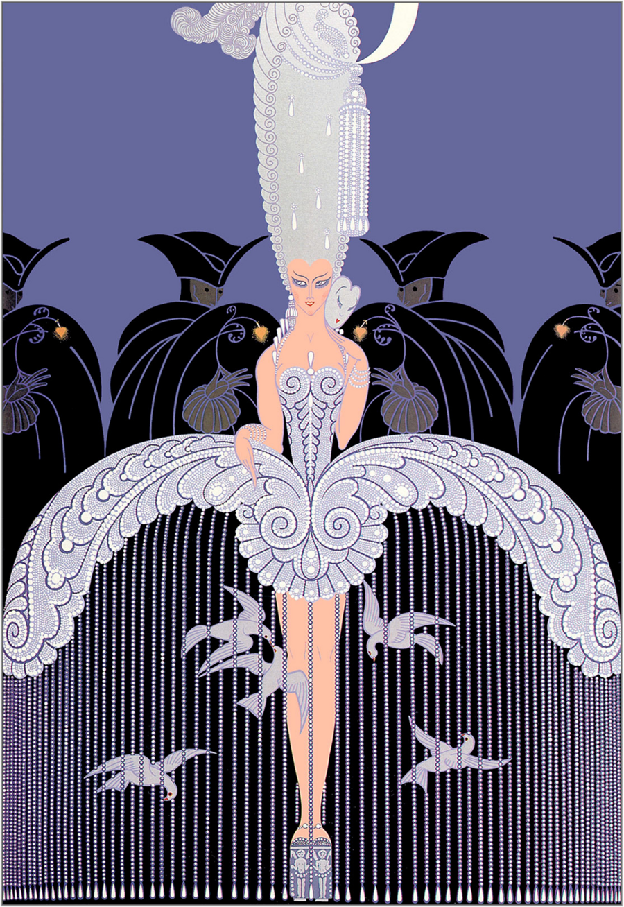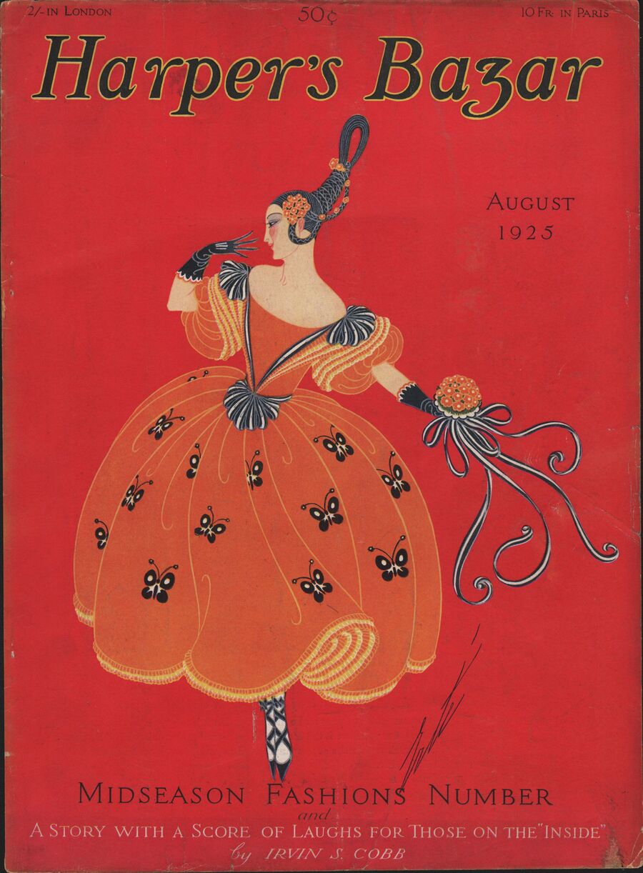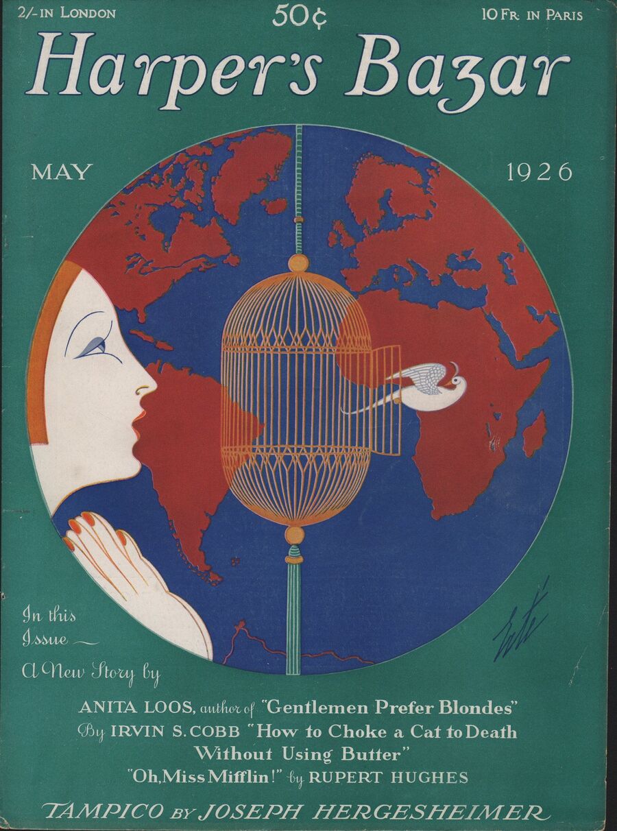 И Эрте (Роман Тыртов) — непревзойдённый иллюстратор каталогов и журналов моды эпохи ревущих двадцатых, весьма изящно изображавший яркие образы своих современников и их пышной жизни с глубокими деталями и отсылками к историческим и социальным явлениям. Так, сюжет его обложки для Harper’s Bazar овеян чувством освобождения: высвобождение птицы из клетки можно считать метафорой беззаботности и легкости во послевоенное время улучшения экономики.