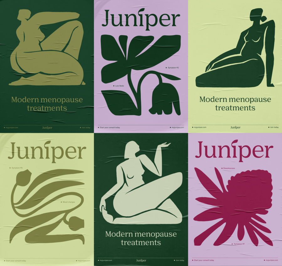 Кроме того, подобно мебельной ткани Фрэнка Добсона 1938 года, запечатлевающей сюжет похищения Европы, упрощенные силуэты женщин, вдохновлённые этническими мотивами и произведениями фовистов, используются и в брендинги от агентства Eucalyptus (иллюстрации Ilana Bodenstein) для австралийской телемедицинской клинике Juniper.