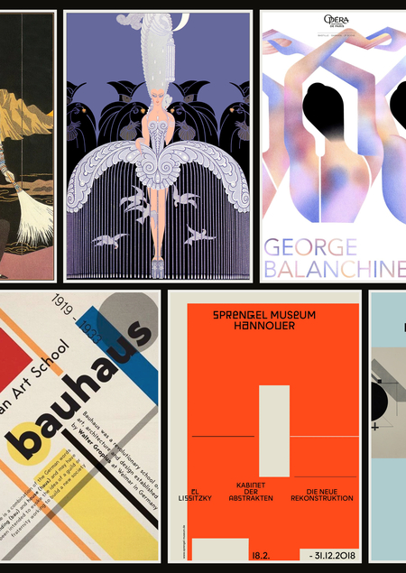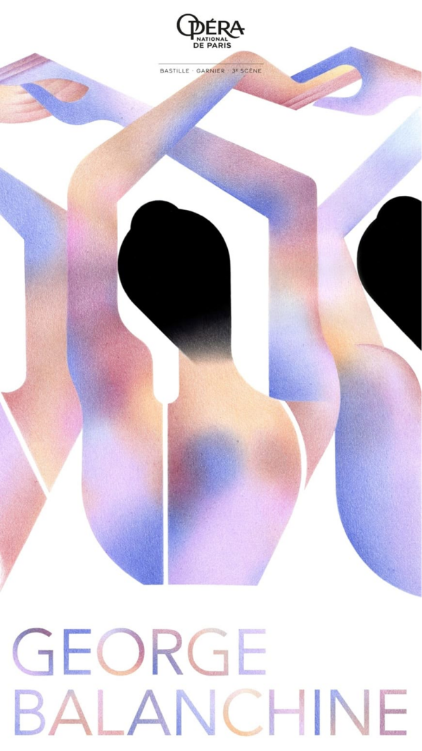 Так, театральная афиша для балета George Balanchine в национальной французской опере использует иллюстрации танцовщиц, которые изображены спинами к зрителю с изящно поднятыми вверх и перекрещенными руками, создающими вертикальный ритм в композиции. И хотя данный плакат имеет некую схожесть с произведением «Ее тайные желания» Эрте — автора многих обложек для журналов мод ревущих двадцатых, он все же отличается большим упрощением изображаемых женских фигур и отсутствием детализации роскошных нарядов дам, как это великолепно отображено на работе Эрте.