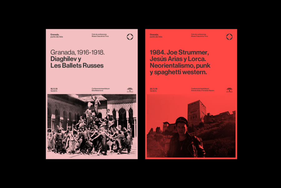 Еще один яркий проект «Granada, punto de mira» от упомянутого выше испанского агентства Plácida, созданный согласно принципам баухауса, это оформление визуальных материалов для цикла культурно-просветительских конференций, посвященных исследованию влияния города Гранада на творческих людей.