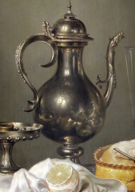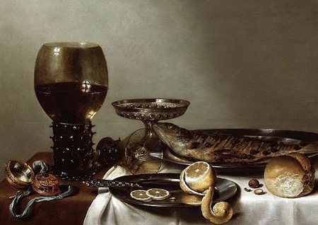 Предметы на натюрмортах лежат хаотично. Например, на работе Виллема Класа Хеда «Натюрморт с серебряным кубком» мы видим небрежно лежащий бокал, который словно случайно попал в тарелку с ещё недоеденным пирогом. Художник передаёт объём предметов, прописывает детали, что делает фрагменты реалистичными. Недопитый бокал на «Натюрморте с серебряной вазой и часами» также выглядит словно настоящий, а рядом лежащая недоеденная закуска в виде оливок доказывает, что трапеза была начата, но еще не закончена.