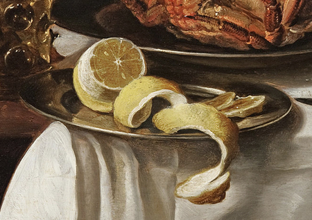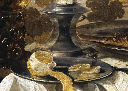 Питер Клас, фрагменты «Натюрморт с рёмером, крабом, лимоном, хлебом и фигурной солонкой» (1643)