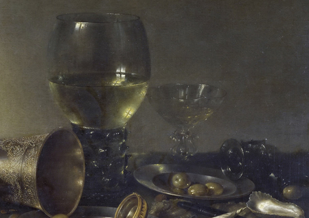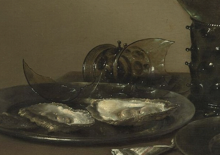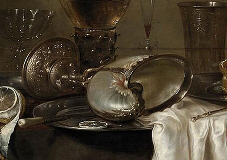 Виллем Клас Хеда, фрагмент «Натюрморта с серебряной посудой и устрицами» (1632); Питер Клас, фрагмент «Натюрморта с бокалом и серебряной чашей» (середина XVII века)