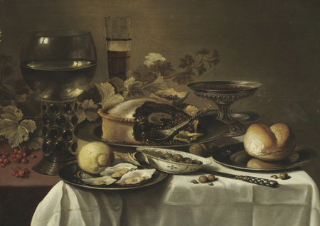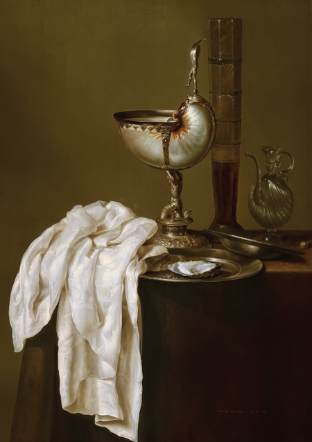 Виллем Клас Хеда «Натюрморт с чашей из раковины наутилуса» (1645); Питер Клас «Натюрморт со смородиной, ремером, пирогом, устрицами и хлебом» (1654)