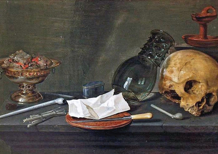 Нередко в работах голландских живописцев можно увидеть элементы натюрмортов «суета сует», о которых уже было сказано в исследовании. Образ черепа олицетворяет мысль о том, что жизнь имеет конец. Тело человека всегда закончит существование, физически перестанет развиваться. Небрежно лежащая бумага (часто с записанными на ней нотами) показывает вечную жизнь искусства. Композиция передаёт особое противопоставление. Кости и череп лежат прямо на трудах человека. Даже если физически человек покинул мир, его душа и искусство, оставленное им, продолжит своё существование, оставит после себя след. Материальное всегда уступать духовному по мысли голландцев.