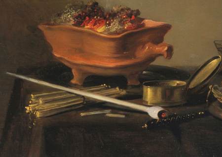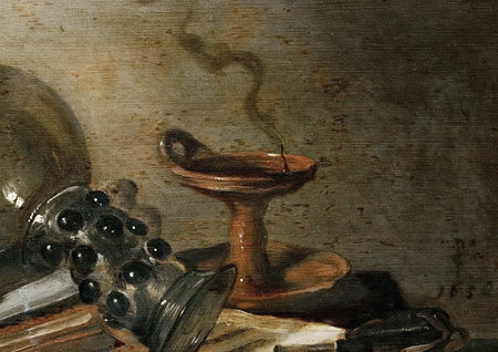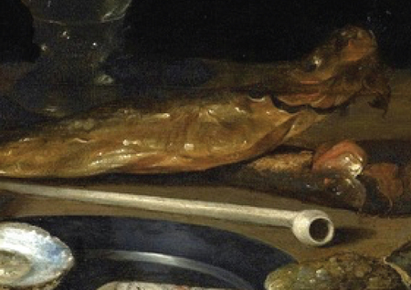 Питер Клас, фрагменты «Натюрморта с жаровней, сельдью, устрицами и курительной трубкой» (1624)