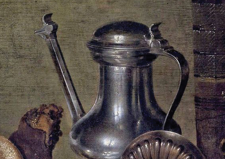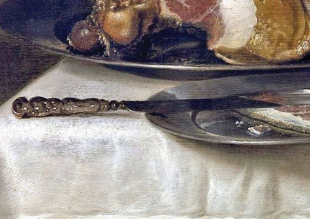 Металлические изделия также имеют особый тайный смысл. Серебро — признак роскоши, а, соответственно, большой кувшин отражает жадность и тщетность общества. Во-вторых, нож имеет отдельный смысл. Он — символ смерти. Отметим также, что рядом с ножом лежит отрезанный кусочек ветчины (символ богатства), что показывает, что всё материальное не имеет духовной ценности.