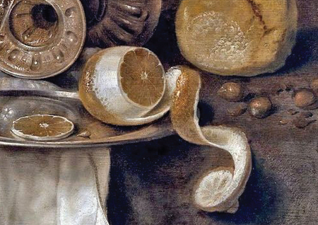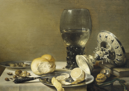Питер Клас также отражает особую красоту в небрежности деталей натюрморта. На работе «Натюрморт с кемером, крабом и очищенным лимоном» мы видим не до конца очищенный лимон и слегка надрезанную ножом булочку. Зритель понимает, что продукты ещё свежи. Человек словно только что покинул это место, оставив на столе все, как есть. Художник показывает естественную обстановку, не идеализируя завтрак.