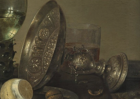 Виллем Клас Хеда, фрагменты «Натюрморта с серебряным кубком» (1637), «Натюрморта с серебряной вазой и часами» (1633)