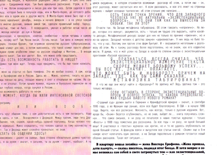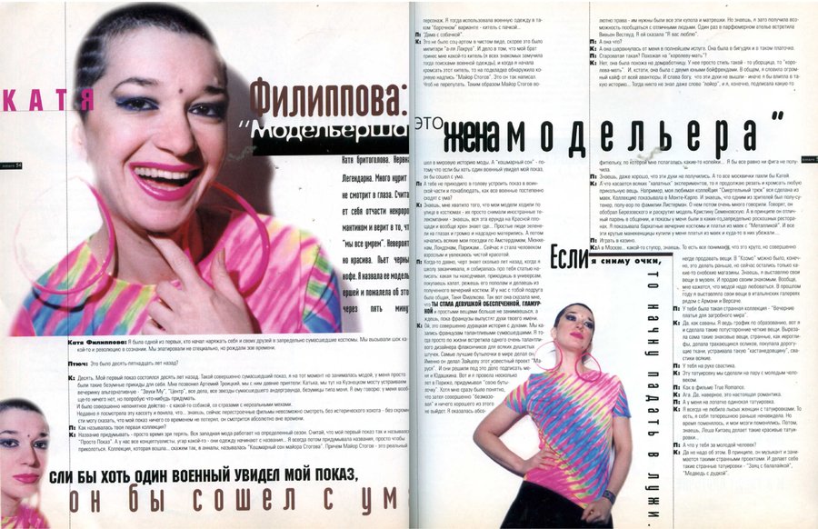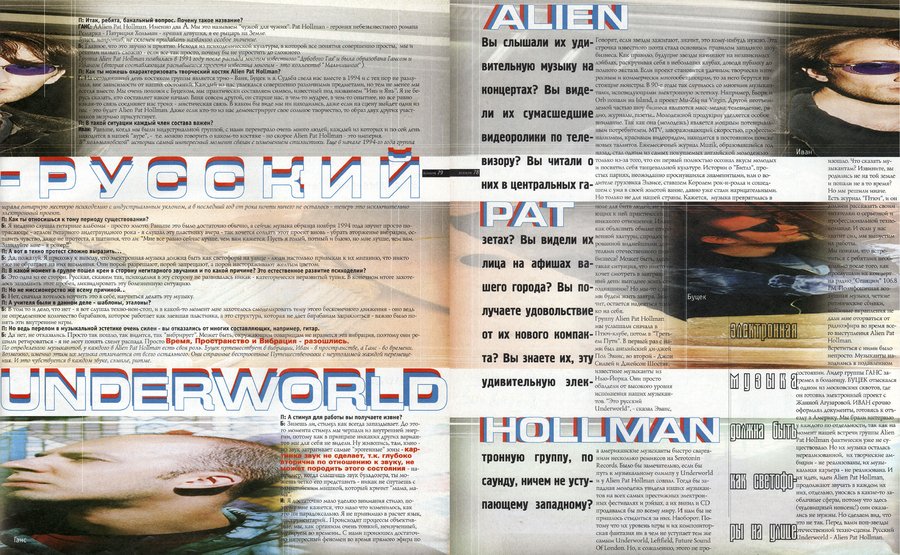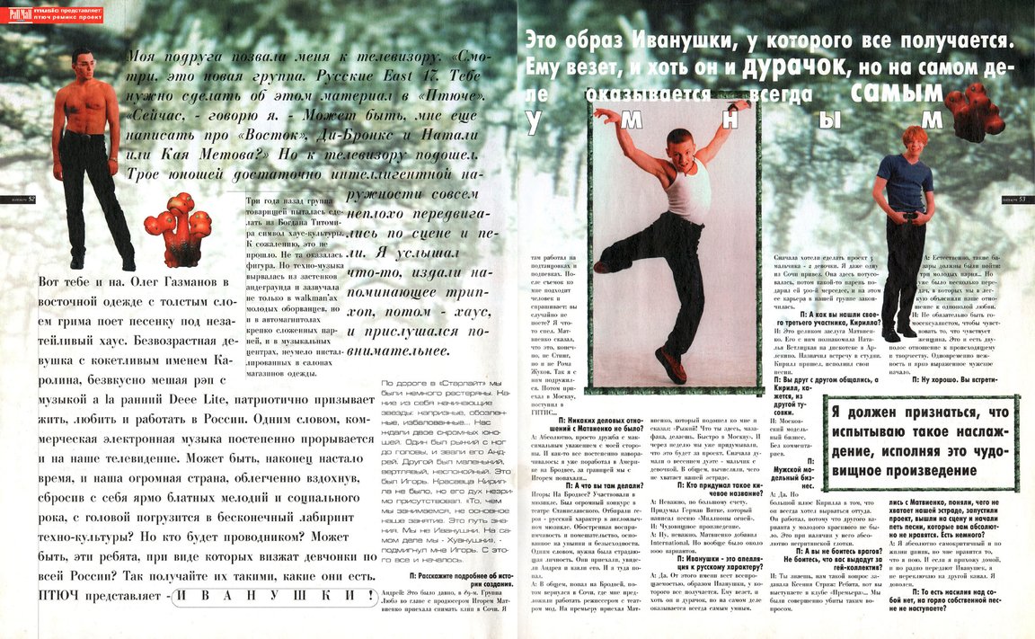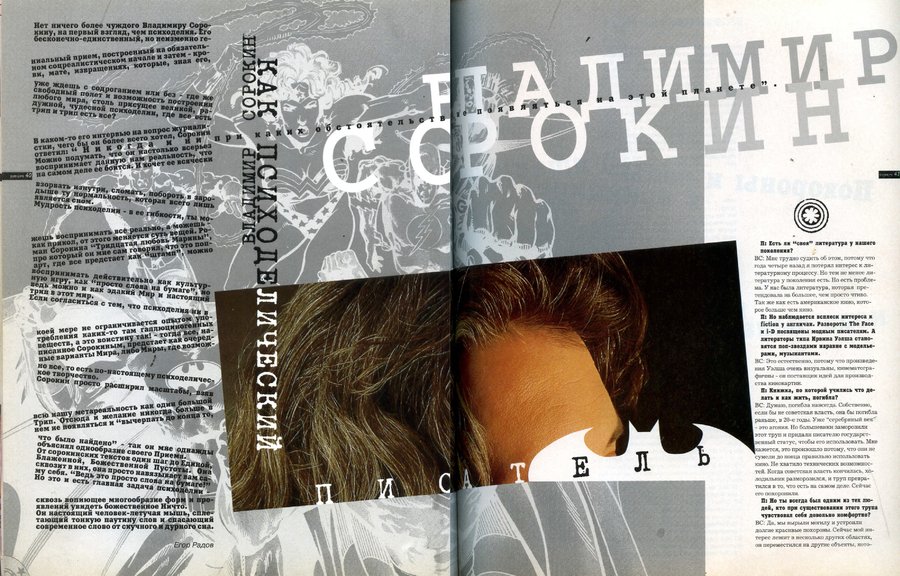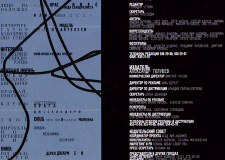 Журнал брал интервью у известных, нередко скандальных личностей из разных сфер: музыка, кино, литература, мода. Страницы были посвящены творческим личностям — Владу Монро (Владиславу Мамышеву-Монро), ключевым фигурам литературного андеграунда, таким как Владимир Сорокин, а также популярным музыкальным коллективам — «Иванушки International». Помимо них, журнал брал интервью у актрисы Ингеборги Дапкунайте, художника и дизайнера Андрея Бартенева, а также знакомил свою аудиторию с творчеством зарубежных икон, перепечатывая и публикуя интервью с такими авторами, как Уильям Берроуз, Аллен Гинзберг и Чарльз Буковски.