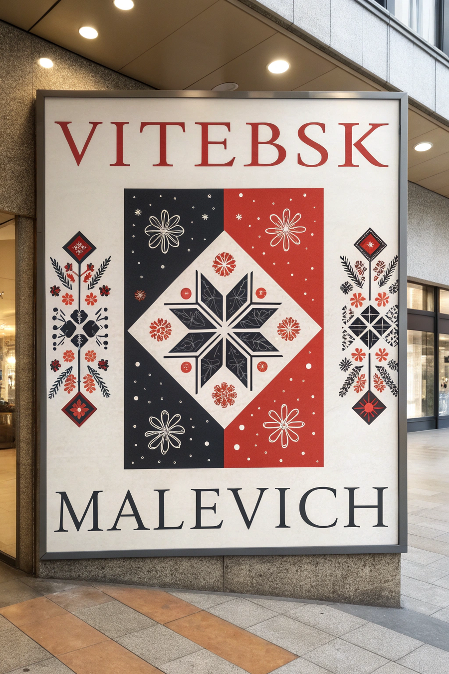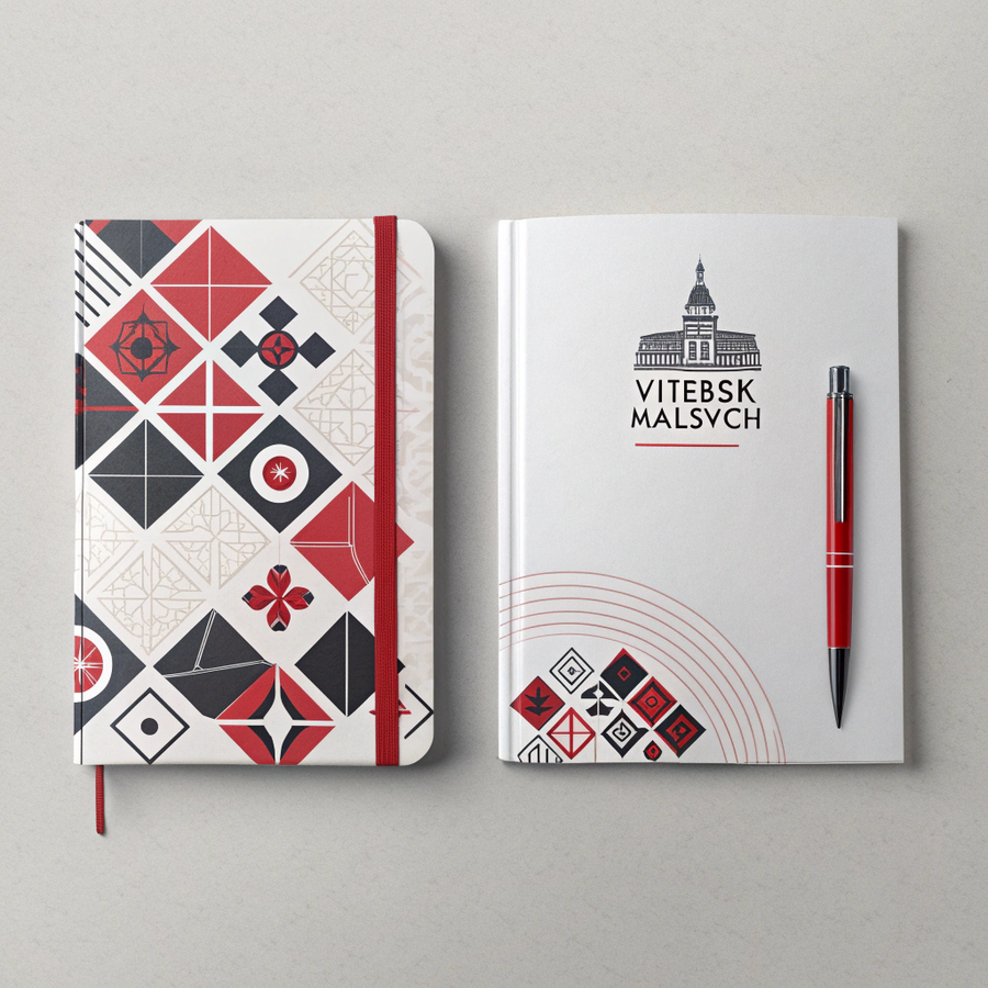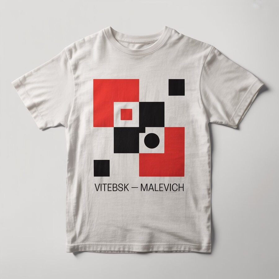 ПОСТЕР: Poster design for the exhibition ‘Vitebsk — Malevich’. Concept: fusion of Belarusian folk embroidery motifs with Kazimir Malevich’s suprematist geometry. Abstract geometric shapes — red, black, white — combined with embroidered texture and ornamental patterns. Minimalist composition, museum poster aesthetic, elegant typography, contemporary art design, A1 format, clean layout, professional art direction.» УЛИЧНЫЙ ПОСТЕР: «Urban exhibition poster for ‘Vitebsk — Malevich’, suprematism meets Belarusian ornament, modern graphic design, bold color contrast (red, black, white, beige), minimalist grid layout, strong typographic hierarchy, placed on Moscow street billboard, realistic photo mockup.» СЕРИЯ ПОСТЕРОВ: «Set of exhibition banners for ‘Vitebsk — Malevich’, dynamic layouts combining suprematist forms with Belarusian textile patterns, vertical and horizontal ratios, high contrast geometric composition, vector-style clean render, museum branding aesthetic.» МЕРЧ: ФУТБОЛКА: T-shirt design for the exhibition ‘Vitebsk — Malevich’, fusion of Belarusian embroidery pattern and Kazimir Malevich’s suprematist geometry, minimalist red-black-white print on white cotton fabric, central geometric composition (square, cross, circle), clean modern layout, museum merchandise aesthetic, professional studio mockup, soft fabric texture, front and back view. КЕПКА: Baseball cap design for the exhibition ‘Vitebsk — Malevich’, embroidered logo inspired by Kazimir Malevich and Belarusian folk patterns, black cap with red-white geometric stitching, minimalist branding, product photography style, 4K. ЧЕХОЛ: Phone case design for ‘Vitebsk — Malevich’, modern minimalist suprematist pattern merged with Belarusian embroidery, abstract red and black composition, white background, glossy finish, artistic souvenir concept БЛОКНОТ: Notebook and exhibition catalog design for ‘Vitebsk — Malevich’, suprematist cover layout fused with Belarusian ornament, red and black geometric shapes on matte white paper, minimalist typography, museum branding, realistic stationery mockup. ТЕКСТИЛЬ: Textile design for ‘Vitebsk — Malevich’, Belarusian embroidery motifs reinterpreted through Malevich’s suprematism, geometric red-black-white pattern, soft fabric texture, decorative pillow and scarf mockup, elegant museum souvenir style.
