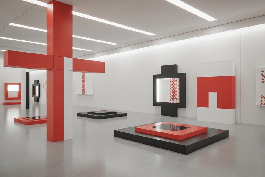 ОБЛОЖКА ПРОЕКТА: Poster or cover design for the exhibition and concept project ‘Vitebsk — Malevich’. Concept: fusion of Kazimir Malevich’s suprematism and Belarusian folk embroidery. Abstract geometric composition with red, black, and white shapes — squares, crosses, circles — merging with fine embroidered textures. Clean minimalist layout, contemporary art design, museum aesthetic, bold typography (‘ВИТЕБСК — МАЛЕВИЧ’), balanced composition, soft light and paper texture, A2 poster or portfolio cover format, professional graphic design.» ФАСАД МУЛЬТИМЕДИЙНЫЙ: Architectural facade of the Manege building in Moscow redesigned for the exhibition ‘Vitebsk — Malevich’, large-scale contemporary art installation, inspired by Russian avant-garde and suprematism, geometric composition on the façade, red-black-white shapes, dynamic abstract forms, modern lighting accents, evening atmosphere, pedestrians nearby, ultra-realistic architectural render, cinematic lighting, photographed with 35 mm lens, 8K resolution» ФАСАД АРХИТЕКТУРНЫЙ: «Architectural render of the Moscow Manege transformed into a multimedia art façade for the exhibition ‘Vitebsk — Malevich’. Large-scale LED and projection mapping installation combining Kazimir Malevich’s suprematist geometry with traditional Belarusian embroidery motifs. Dynamic red, black, white and gold patterns, animated light composition across the classical building, fusion of avant-garde and folk culture, modern urban atmosphere, evening lighting, realistic architectural visualization, ultra-detailed, photographed with wide-angle lens, 8K render.» ОФИС: Creative co-working office in Park Malevich style, white minimalist furniture, geometric art pieces on the walls, bright diffused lighting, Bauhaus-inspired color palette (red, black, white), large windows, serene atmosphere» ТОРГОВАЯ ПЛОЩАДКА: «Architectural visualization of the exhibition merchandise space ‘Vitebsk — Malevich’, minimalist modern interior inspired by Kazimir Malevich’s suprematism and Belarusian embroidery motifs, geometric layout with red-black-white accents, square and cross-shaped displays, clean white walls, soft museum lighting, futuristic yet cultural atmospher ЛОГО: Logo design for the exhibition ‘Vitebsk — Malevich’, fusion of Kazimir Malevich’s suprematist geometry and Belarusian folk embroidery motifs, minimalist symbol using red, black, and white shapes
