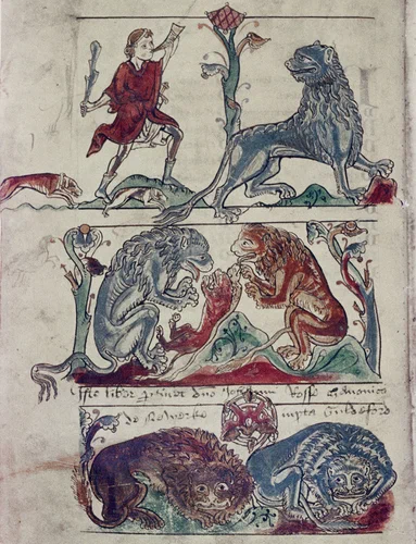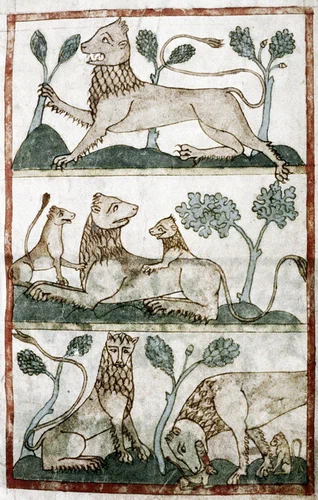 Бестиарии, собранные в Бодлианской библиотеке Оксфордского университета. Согласно средневековым воззрениям, дитеныши льва родятся бездыханными, на третий день родители «вдыхают жизнь» в потомство