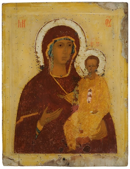 Богоматерь Одигитрия Смоленская, со святыми Кириллом Белозерским и Сергием Радонежским (?) на полях XVI век