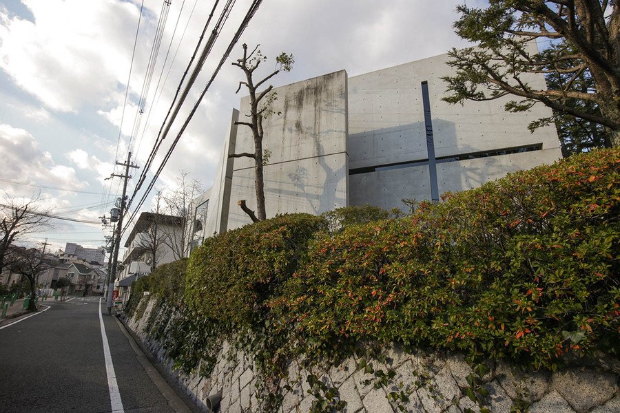 «Открытый» бетон Тадао Андо со следами от опалубок, справа — частный дом Адзума» (1976 г.), слева — Художественный музей префектуры Хёго (2002 г.).