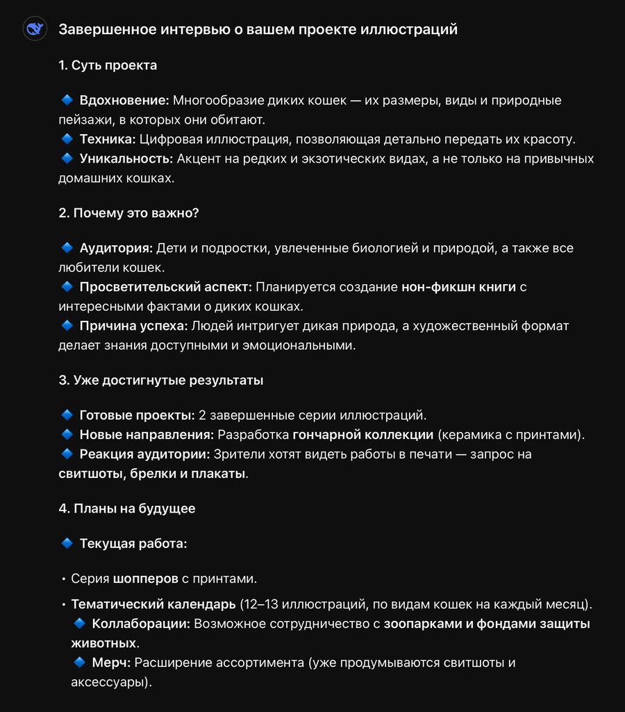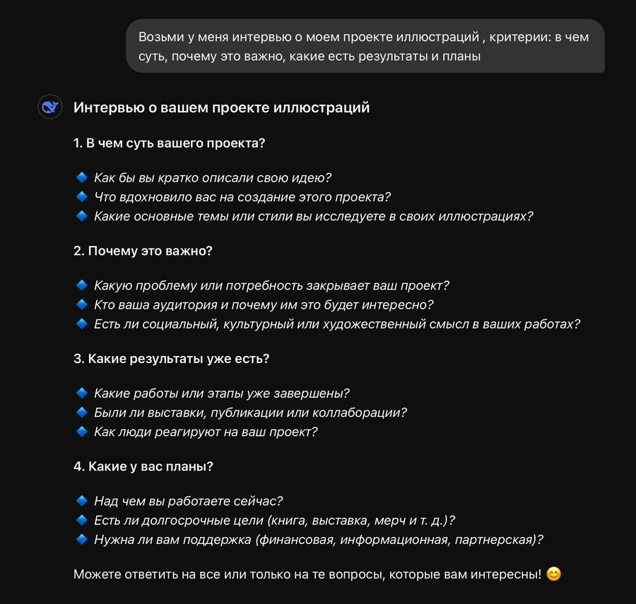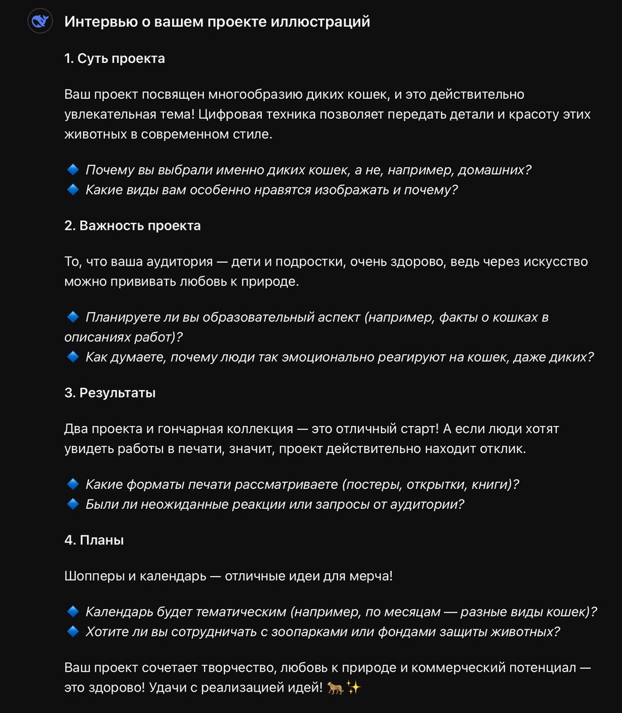 Для создания статьи я использовала нейросеть DeepSeek, которую попросила меня взять интервью о моем проекте иллюстраций. Нейросеть с этим заданием справилась отлично и даже дала мне идеи о том, какие коллаборации можно сделать.