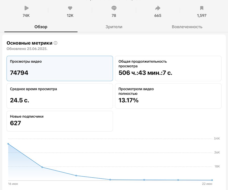 Ролик в TikTok набрал очень высокие для нынешней статистики аккаунта 74 тысяч просмотров и принес мне много новой аудитории. Отмечу следующие причины: 1. Чёткие и яркие субтитры, которые больше интересуют зрителей 2. Ролик с процессом разделен на 2 части, что мотивирует зрителя подписаться и ждать продолжения 3. TikTok продвинул ролик и показал его большему количеству людей из-за длинного описания 4. ИИ работало как дополнение к уже имеющемуся конвенту, созданному человеком 5. Аккаунт в TikTok уже имел аудиторию, однако из последних роликов этот стал самым популярным