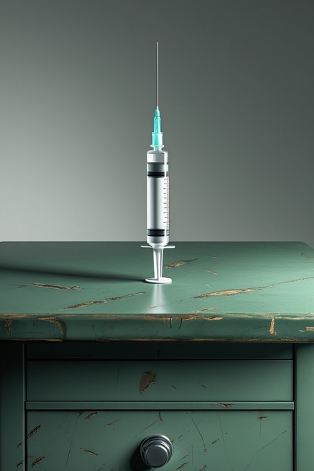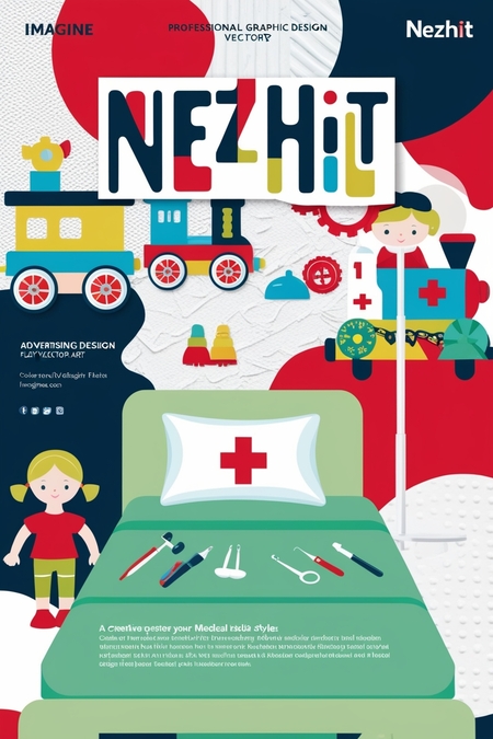 A vibrant advertising poster for NEZHIT, showcasing medical tools placed on a light green medical bed. The background features a playful collage of abstract children’s toys like trains and dolls, combined with a mix of textures and patterns in white, bright red, and dark blue tones.