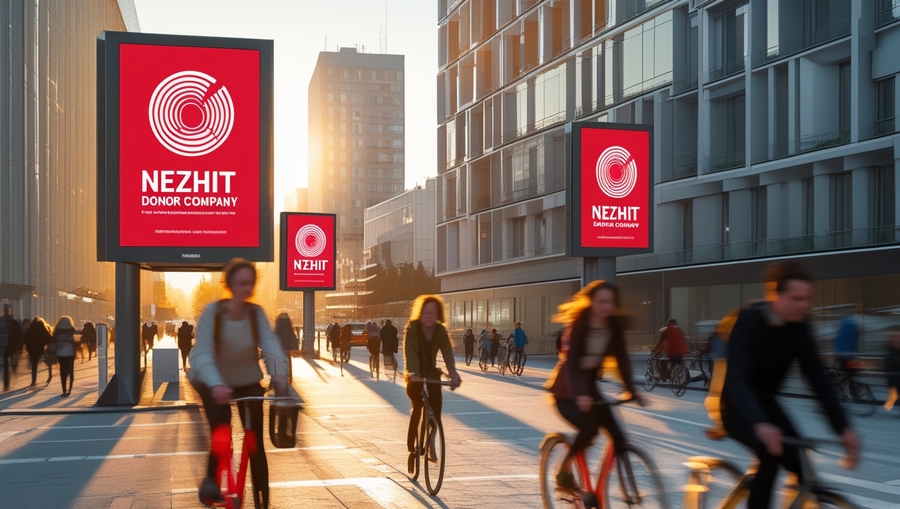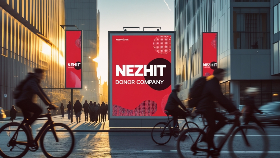 /imagine prompt: create a mockup of a modern artistic poster in a freehand style for the NEZHIT donor company, displayed in an urban European city setting on billboards.