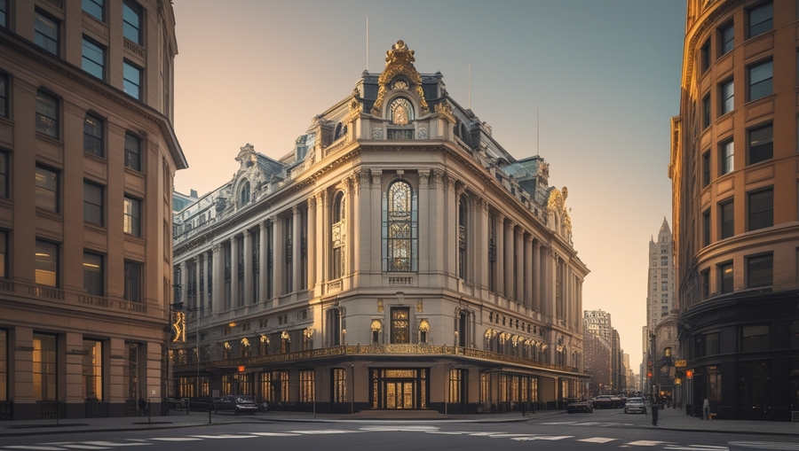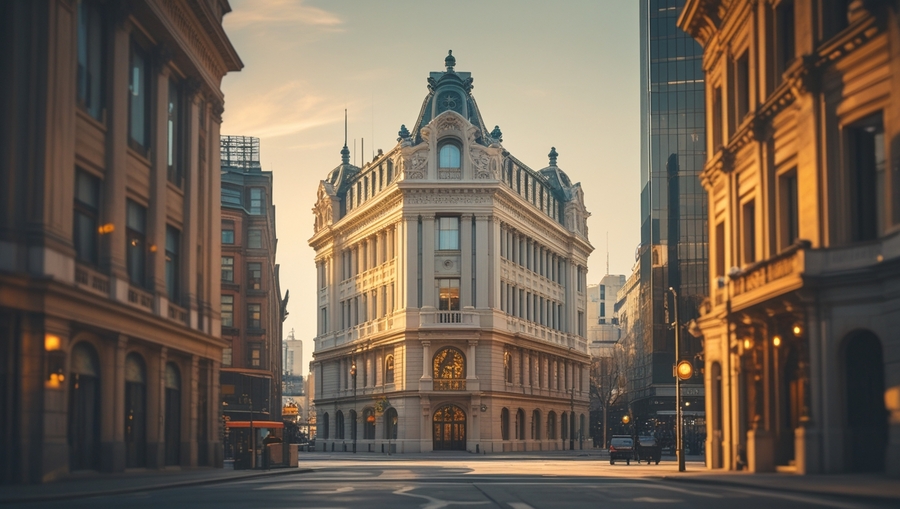 In the heart of the city, one beautifully designed building takes center stage, with understated surroundings that enhance its grandeur, blending classic and modern elements.
