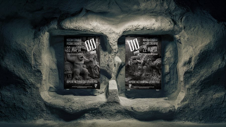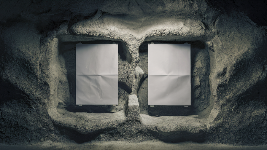 Ideogram: two empty white a3-sized posters against the background of ancient cave-like rocks, the light falls dusty gray