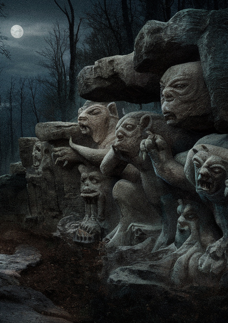 Ideogram: A hauntingly beautiful image of ancient Russian rock carvings. There are detailed figures of mythical creatures and beast-like entities, some with horrifying expressions, with their claws and fangs extended. The rock carvings are surrounded by a dense and eerie forest, with a faint full moon illuminating the scene. A chilling atmosphere permeates the image, blending ancient history with the supernatural.