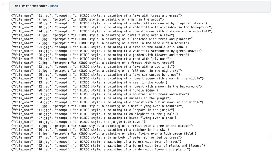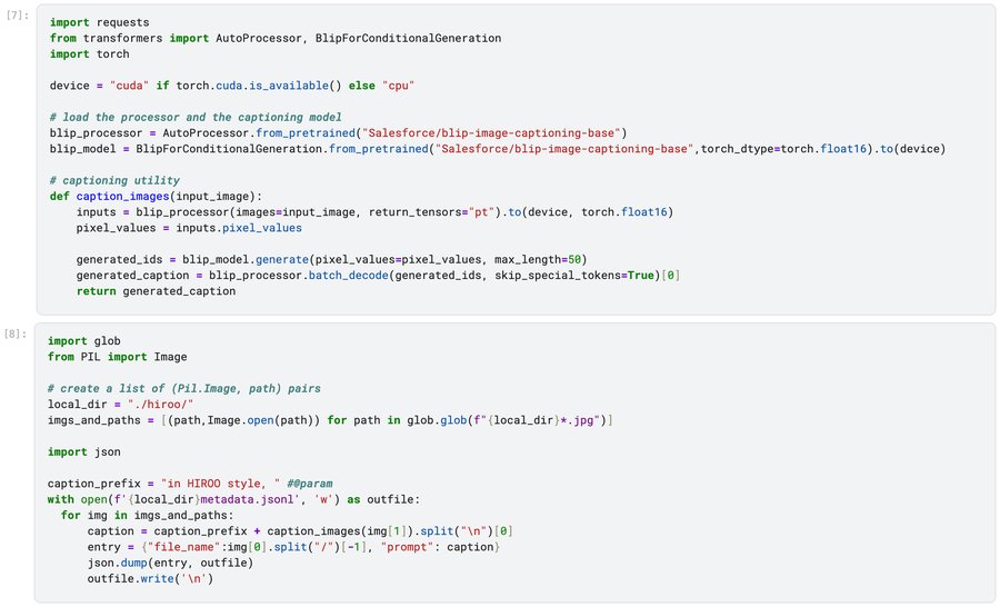 Далее я приступила к этапу обработки изображений и созданию описаний к ним с помощью BLIP. Для своей нейросети я задала параметр, с которого должно начинаться каждое описание: «in HIROO style».