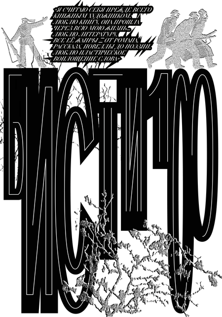 This poster is dedicated to the Soviet schedule of Dmitri Bisty. In it I tried to convey a unique master style combining the monumentality of images with the fineness of graphics. The composition used fragments of Bisty’s illustrations for Vladimir Mayakovsky’s poem «B. I. Lenin and Irving Stone’s „The Want for Life“ novel