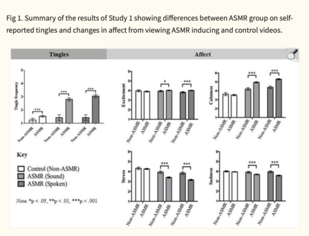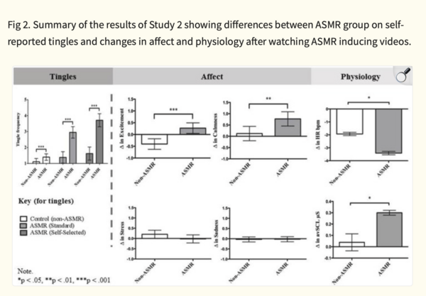 Исследование сравнило две группы: людей, которые заявляли, что испытывают ASMR, и тех, кто этого не делает. У первой группы наблюдалось значительное снижение частоты сердечных сокращений (в среднем на ~3,14 ударов в минуту) при просмотре ASMR-видео по сравнению с контрольной группой. Кроме того, в опросе более 1 000 участников ASMR-чувствительные люди сообщали более частое возникновение ощущения покалывания, повышение расслабления и социальных чувств, снижение стресса и грусти, тогда как контрольная группа таких эффектов не показывала.