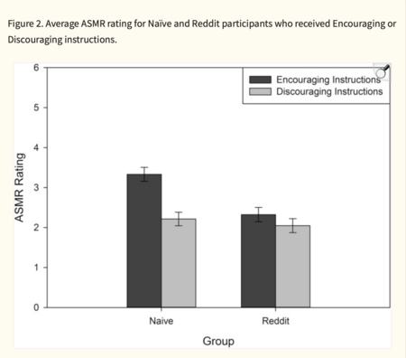 Участникам предоставляли клипы с ASMR-триггерами и нейтральные записи, а также давали разные инструкции: одни получали поощряющее сообщение («вы можете почувствовать ASMR»), другие — нейтральную установку. У новичков ощущение ASMR заметно зависело от инструкции: ожидание повышало вероятность реакции. У опытных пользователей этот эффект почти исчезал — они реагировали более стабильно и вне зависимости от подсказок.