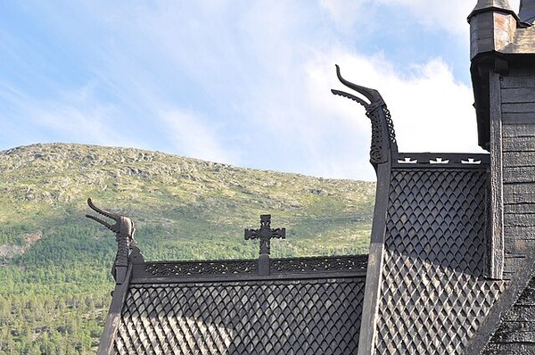 Деревянная церковь Лом, Норвегия, головы дракона, XII в. Фотография Миха. Л. Ризер, 2010 г./Холмы Норвегии, 2019 г.
