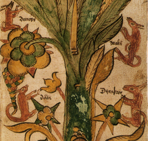 Иггдрасиль, фрагмент иллюстрации из исландской рукописи XVII века. Рукопись хранится в Институте Арни Магнуссона в Исландии /Фрагмент порта ла северной стены Урнеса, Норвегия, XII в.