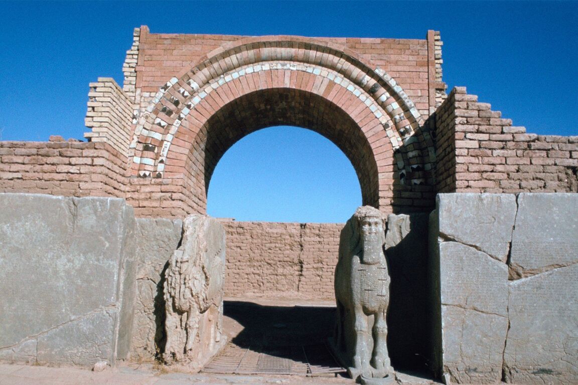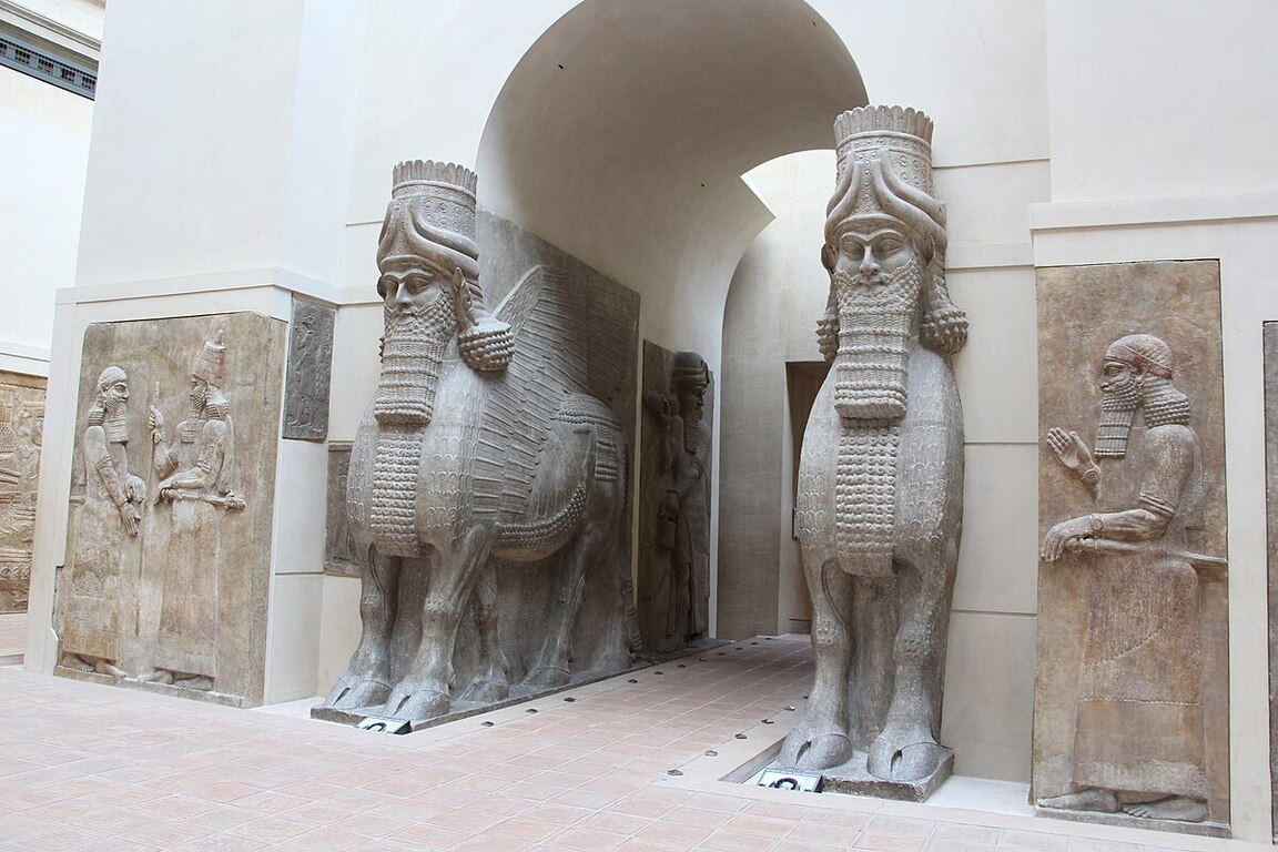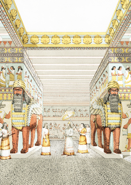 Центральный архитектурный мотив ассирийских дворцов — массивные ворота и проходы, охраняемые каменными крылатыми быками-ламассу. Их функция была двойной: религиозно-охранительная и символическая, подчёркивающая, что власть царя опирается на сверхъестественные силы.