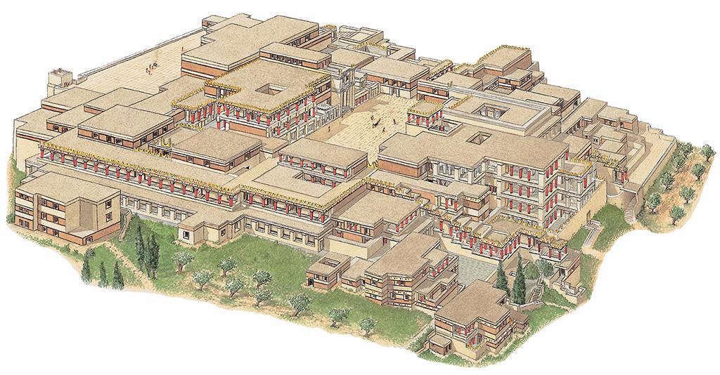 Особенность критских дворцов — многоуровневость, сложная лабиринтная структура, большое количество комнат различного назначения, от складских помещений до мастерских.
