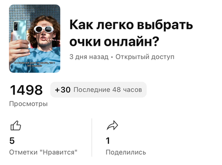 На платформах DTF.ru и VC.ru я опубликовала одну и ту же статью по теме: «Тест для подбора очков онлайн: инновационный подход к выбору оправы». На DTF пост собрал больше просмотров, так основные темы сайта — игры, разработка приложений, IT сфера, а моя статья как раз об опыте создания рекламной активации с помощью геймификации внутри мобильного приложения.