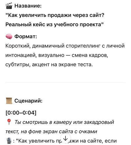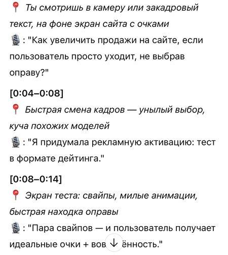 Для начала, я проанализировала популярные ролики на платформе YouTube Shorts и поняла, что необходимо цепляющее начало. Первое видео начиналось так: «Ненавижу выбирать очки <…>», второе — «Как увеличить продажи на сайте?».