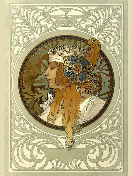 Альфонс Муха — художник, работавший в стиле модерна на рубеже XIX и XX веков. Он известен многим своим индивидуальным, запоминающимся стилем. Альфонс Мария Муха был одним из первых художников, вошедших в сферу дизайна, создавая различные афиши и визитки. Данный формат поспособствовал развитию декоративных элементов в его торчестве и творчестве его современников и последователей.