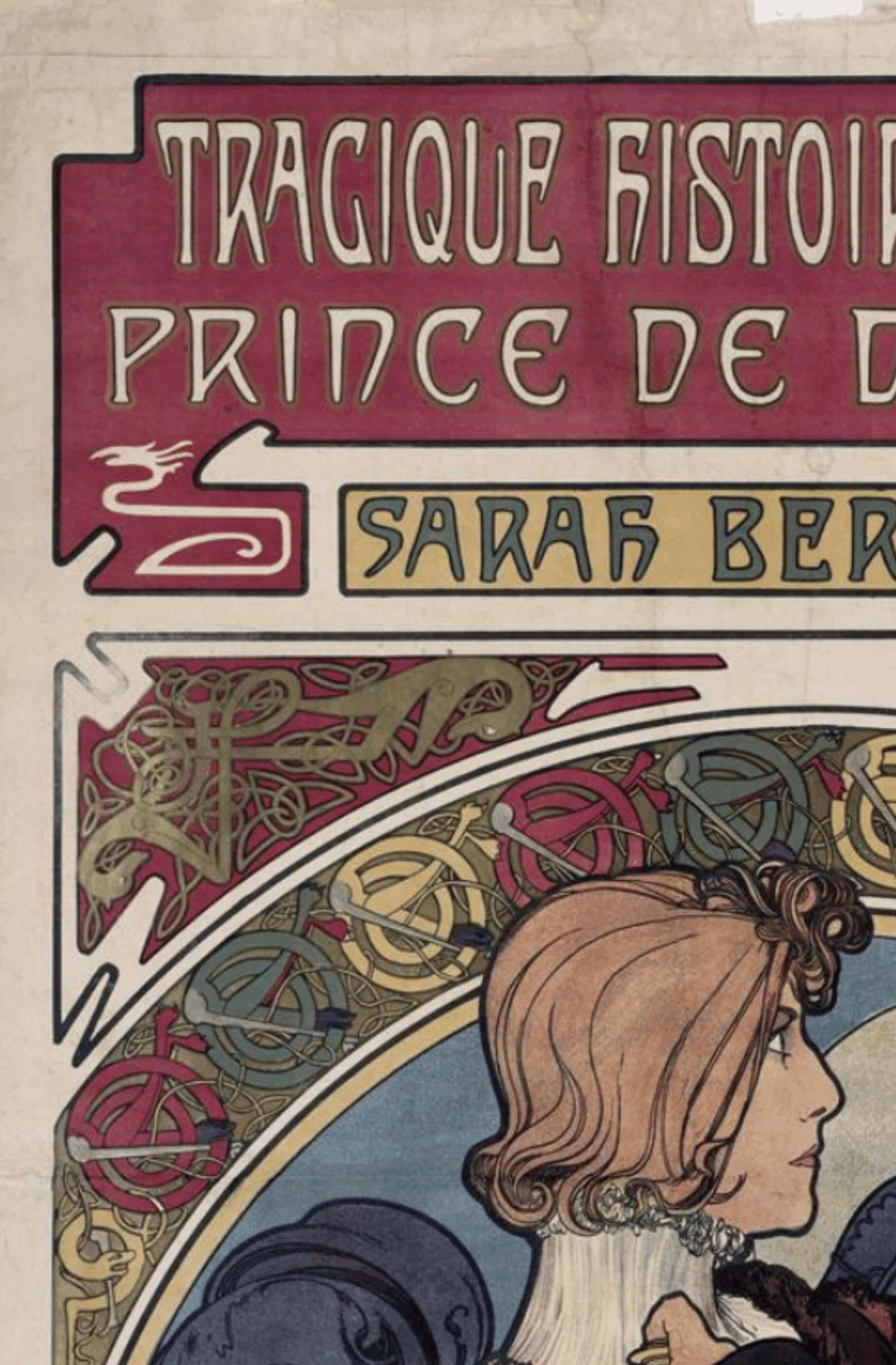 С помощью орнамента и других декоративных элементов Альфонс Муха даже рассказывает историю. Многим извествно о сотрудничестве с актрисой театра Сарой Бернар, для которой было сделано множество афиш рукой Альфонса Мухи. Например, на афише «Гамлет» помимо ярко выраженной фигур рыцаря и возлюбленной самого Гамлета также можно заметить витиеватые узоры. Вспоминая сюжет пьесы, стоит обратить внимание на фразу главного героя: «Я безумен только при норд-норд-весте; когда ветер с юга, я отличаю сокола от цапли», после чего становится понято, что в обрамнеии прячутся не только простые узоры но и образы сокола и цапли, являющиеся ключевыми для истории, раскрывающими тонкости сюжета.
